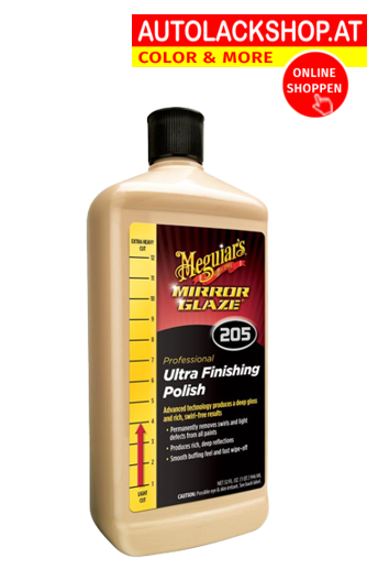 Meguiar's Mirror Glaze 205 Ultra Finishing Polish ist mit der neuen Super-Micro-Abrasive-Technologie ausgestattet und eignet sich optimal als Finishpolitur für die Nacharbeit nach der Anwendung starker Polituren der Mirror Glaze Serie. Natürlich ist die Politur auch als "Stand-alone" Produkt gegen leichtere Kratzer und Swirls einsetzbar. Das Produkt kann sowohl per Hand, Rotation- und Excenterpolierer angewendet werden kann. Die spezielle Zusammensetzung sorgt für ein staubfreies, sauberes Arbeiten und ein kinderleichtes Auspolieren. Es bleibt ein wunderbarer, kratz- und schlierenfreier Hochglanz - die perfekte Vorarbeit für das finale Wachs. Die 205 Ultra Finishing Politur ist silikonfrei.
